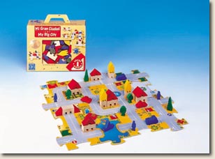 ciudad que incluye coches, casas, personajes y otros complementos de madera, además de 16