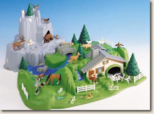 desmontable, montaña, río, animales, un puente, árboles y dos personajes para el