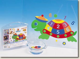 los números del 1 al 6. Al mojar las piezas se adhieren a superficies lisas. Tamaño aproximado: 27 x 50 cm